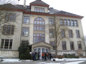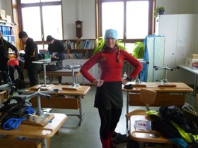 Treffpunkt ist in Neuhausen am Rheinfall im Kanton Schaffhausen/Schweiz vor dem Schulhaus Kirchacker, ca. 20 km von der deutschen Staatsgrenze entfernt. Zugleich ist hier auch Daniel’s Wirkungsstätte im täglichen Arbeitsleben. Den Grundschülern der 1. – 3. Klassen lehrt er das Einmaleins. Eines der Klassenzimmer dient uns kurzfristig als Umkleideraum, dafür wird extra das Schulhaus aufgesperrt. Zum Lauf hat er wunderschöne Retro-Startnummern aus Stoff organisiert von einem mittlerweile aufgelösten Sportverein.