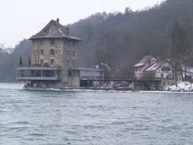 Runter geht’s bedeutet schneller, in einem Rutsch werden alle Höhenmeter wieder egalisiert. Zwischen den Bäumen kann man wieder den Rheinfall ausmachen. Am Kassenhaus zur Aussichtsplattform herrscht noch immer gähnende Leere. Über eine Million Besuchern pro Jahr finden sich hier ein und damit ist es eine der touristischen Hauptattraktionen der Schweiz. Vorbei an Schloss Laufen geht’s direkt runter ans Ufer des Rheins.