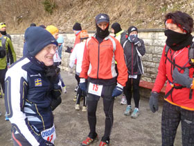 Kurz vor unserem Start- und Ziel werden noch zwei Boxen deponiert, wo wir Thermoskannen und andere Getränke einlagern können. Ich habe gleich zwei dabei mit heißem Tee und fülle mir eine Trinkflasche mit dem noch dampfenden Gebräu für die erste Runde auf. Mit leichter Verspätung geht’s um 10.15 Uhr los. Ca. 250 Höhenmeter pro Runde sind uns versprochen, macht summa summarum 1.000 für die den ganzen Kurs, das ist nicht zu unterschätzen. Die ersten davon dürfen wir gleich vom Start weg einlösen, deftig geht’s nach oben.