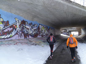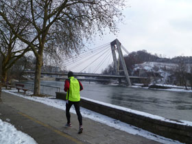 Nach einem guten Kilometer haben wir den Uferweg am Rhein erreicht, genau in östliche Richtung schwenkt unsere Laufrichtung, der Kurswechsel ist wie ein kleiner Schock, sibirisch bläst uns der Wind entgegen. Der Wind-Chill-Faktor lässt die Minusgrade doch gefühlt fast verdoppeln. Gut dass bei Laufveranstaltungen das Vermummungs-verbot nicht gilt, alles Verfügbare wird über‘s Gesicht gezogen.