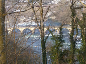 Am Flurlinger Steg gibt es leider eine kleine Kursänderung, der Rheinuferweg wurde wegen dringenden Arbeiten der Kraftwerksbetreiber gesperrt, so müssen wir etwas links davon durch‘s Industriegebiet weiter. An der imposanten Schrägseilbrücke der Autobahn A4 sind in etwa 4 km absolviert und die Stadtgrenze von Schaffhausen erreicht. Wir wechseln auf der direkt daneben liegenden Brücke über. Durch einen Felstunnel erreichen wir den Spazierweg auf der rechten Rheinseite.