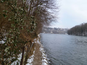 Die nächste Brücke lässt uns wieder die Seite und Laufrichtung wechseln. Der schmale Pfad am Fluss auf Wasserhöhe ist ein Genuss, aber ein Fehltritt würde schon nasse Füße bedeuten, also Vorsicht auf dem Schneeboden. Tolle Eisgebilde haben sich auf dem Wasser an der Uferkante und um Bootsbefestigungen gebildet. Die Eiszeit hat auch schöne Seiten.