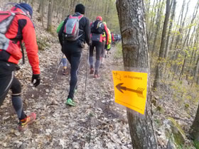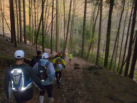 Nach einer Stadionrunde verlassen wir die Zivilisation, unmittelbar danach geht es rein in den angrenzenden Wald und der „Parc naturel régional des Vosges du Nord“ hat uns verschlungen. Bergauf, bergab ziehen wir von Anbeginn über schmale Pfade, Laub und Waldwege durch den Forst. Die Temperaturen sind noch etwas frisch, die meisten haben noch Jacken an. Aber dank Rucksack können wir ja ablegen und das wird bald nötig sein. Wir haben einen wolkenlosen Himmel und werden heute angenehme 15 Grad bekommen. Viele Trailer sind mit Stöcken unterwegs. Mich behindern sie beim fotografieren und so hab ich sie zu Hause gelassen. Außerdem ist es hier nicht so sehr steil.