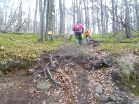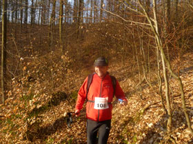 Obwohl die Strecke hervorragend ausgeschildert ist, laufe ich schnurstracks an einer Wegemarkierung vorbei, den Hang hinunter. Bin versehentlich einem Wegweiser der Biker nach. Von hinten höre ich Gejohle. Günter gibt alles, um mich vor meinem Irrtum zu bewahren. 200 m Zusatzaufstieg hat mir das eingebracht. Der falsche Weg war aber vom Veranstalter mit einer Sägemehllinie vorbildlich gekenn-zeichnet, ich bin einfach blind darüber gebrettert. Kilometermarkierungen werden im Übrigen nicht aufgestellt.