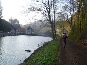Es geht rauf zur Ruine von Burg Schöneck, sie datiert ebenfalls aus dem 13. Jahrhundert. Zerstört wurde sie durch Rudolf von Habsburg wegen Raubritterei. Wir umrunden sie und schon geht’s wieder steil runter, wo uns ein idyllischer Weiher erwartet. Nach der nächsten Klettereinheit bekommen wir hoch oben auf einem Plateau einen wundervollen Überblick über das Winecker Tal geboten. Relativ selten kann auf der gesamten Runde solche Aussichten einfangen.