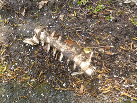 Nach einer längeren Abwärts-Passage durch den Soulzthaler Forst müssen wir vor Mattstall drei Kilometer auf einer Teerstraße zurück legen. Gegenverkehr inbegriffen. Einer musste schon die Segel streichen, am Straßenrand passieren wir eine abgenagte Wirbelsäule. Ob das wohl einer der Trailer war, dem die Straße zu hart war? Mir behagt die Härte auch nicht so recht, deutlich spüre ich meine Fußsohlen auf dem für heute ungewohnten Bodenbelag. Die typischen Elsässer Fachwerkhäuser gibt es beim Ortsdurchlauf von Mattstall zu bewundern.