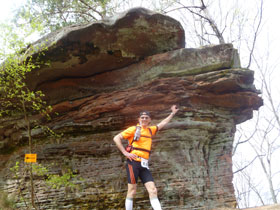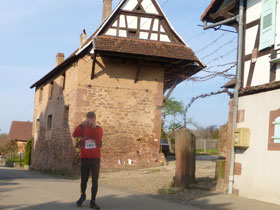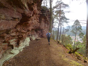 An einer prachtvollen roten Sandsteinwand vorbei führt uns ein Singletrail hinunter nach Dambach. Bevor wir die dritte Versorgungsstelle erreichen, muss noch ein Kilometer auf ungeliebten Asphalt absolviert werden. Organisator Luc Kautzmann wartet schon auf seine Schäfchen. Wir sind spät dran. Leider vergesse ich ihn nach den Zahlen zu fragen, so bleibt für uns das Rätsel.