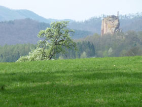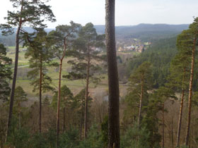 Im Nibelungenlied ist der Wasigenstein Schauplatz des Kampfes von Walther gegen König Gunther und Hagen von Tronje und hat damit besonderen Ruhm erlangt. Vor uns erhebt sich der Burgfelsen auf einem spornartigen Ausläufer. 1878 wurde er unter Denkmalschutz gestellt. Wir ziehen kurz vor dem Abstieg zur Sollstelle daran vorbei.