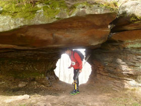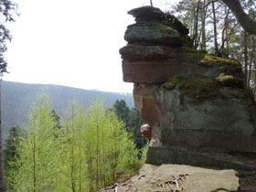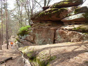 Steine in Pfeilform und ein auffälliges Schild, trotzdem wären wir beinahe an der Abzweigung – noch innerhalb Dambach – vorbei gelaufen. Aber Luc hat aufgepasst und ruft uns nach. Am Ortsausgang wird es sofort wieder steil. Oben steht Burg Hohenfels. Wurde 1679 niedergebrannt, so existieren von ihr nur noch ein paar Mauerreste sowie einige in den Felsen eingehauene Kammern und ein Kerker. Das erspart uns einen größeren Zeitverlust. Dafür bieten aber nochmals einige sehenswerte natürliche Sandsteinkunst-werke Stopps für Aufnahmen.