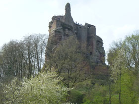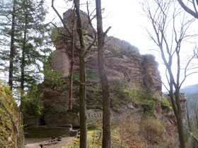 Den Anfang einer stattlichen Anzahl von Burgruinen, die unseren Weg kreuzen, macht Château du Fleckenstein. Schon von Weitem kann man die Burg, hoch oben auf einem Felsen postiert, ausmachen. Über einen herrlichen wurzeligen Pfad, vorbei an wunderschönen Sandsteinformationen werden wir direkt an sie heran geführt. Imposant steht sie auf einem 90 m langen und 30 m hohen Felsplateau.