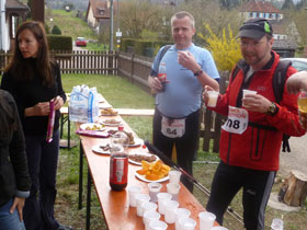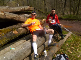 Eine halbe Stunde vor dem Cut treffen wir in Obersteinbach ein und werden sofort in eine Liste eingetragen. Uns bleibt aber noch ausgiebig Zeit zum Verpflegen und unsere leeren Getränkeflaschen wieder aufzufüllen. Neben Wasser werden auch Cola und Bouillon mit Nudeln angeboten. Mit Bananen, Orangen, Trockenfrüchten, Riegeln und Kuchen kann man seinen Hunger stillen.