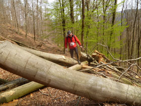 Hindernisse á la Braveheart Battle finden wir bei der nächsten Steigung vor. Waldarbeiter haben am Vortag kräftig gewütet, der komplette Hang ist von gefällten Bäumen übersät. Hier helfen nur ein paar Klettereinheiten weiter. Wenig später passieren wir nur einen Steinwurf entfernt bei Hirschthal die Grenze. Auf deutscher Seite grenzt hier der Naturpark Pfälzerwald an. 1998 wurde er mit dem „Vosges du Nord“ unter der Schirmherrschaft der UNESCO zum grenzüberschreitenden Biosphärenreservat Pfälzerwald/ Nord-vogesen zusammengefasst.