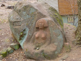 Sie ist in einen beachtlichen Naturstein gemeiselt und hat einen auffallend großen Kopf und breiten Mund, ich hätte sie für eine relativ moderne Skulptur gehalten. Aber weit gefehlt, wie alt sie wirklich ist, weiß man nicht so genau. Die Elsässer nennen sie liebevoll Liese und man geht davon aus, dass sie eine alte prähistorische Göttin darstellt, die an dieser alten Passstraße verehrt wurde. Nur wenige Kilometer von hier entfernt befand sich einst eine Keltensiedlung. Direkt neben der Steingöttin hat der Club Vogesien seine stattliche Clubhütte „Chalet du Wintersberg“ errichtet, in dem er seine Waldfeste feiert.