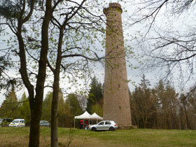 Auf direkten Weg wären wir von hier schnell oben auf dem Gipfel des Col du Wintersberg und an unserem letzten VP, aber da auf dem Pfad der Abstieg runter führt, dürfen wir im weiten Bogen den Berg umkreisen und an anderer Stelle den finalen Gipfelsturm beenden. Le Grand Wintersberg, wie er korrekt heißt, ist mit 581 m Höhe die höchste Erhebung der nördlichen Vogesen. Zu erkennen ist er an einem 25 m hohen Aussichtsturm, unmittelbar daneben ist unsere vierte und letzte Verpflegungsstation errichtet.