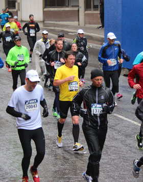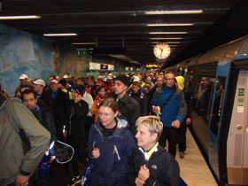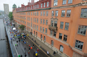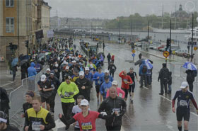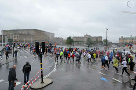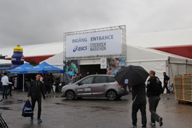 Als ich um 10:00 Uhr morgens vor's Hotel trat, verging mir erst mal die Freude auf meinen sechsten Marathon. Nicht nur dass es regnete, nein es hatte auch nur 5°C und ein Sturm, der einen schon das Gehen schwer machte, war nicht gerade das was ich mir vorgestellt hatte. Aber was soll's. Es gibt kein Jammern. Je weiter ich mich per Tunnelbana der Haltestelle „Stadion“ näherte, umso mehr Läufer quetschten sich in die U-Bahn. Richtig glückliche Gesichter konnte ich nicht ausmachen.