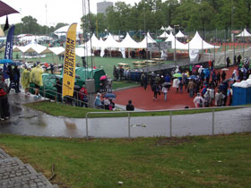 Vor der Östermalms IP, auf der ja auch am Tag zuvor schon die Messe stattgefunden hatte, verabschiedete ich mich von meiner Familie und von meinen Freunden, nicht ohne, dass mich Silke nochmals fragen musste, ob ich mir das bei dem Wetter wirklich antun will. Zum zweiten Mal in meinem Leben antwortete ich ihr mit „Ja, ich will!“ Nachdem ich meine Kleidertüte abgegeben hatte und mir eine Folie übergezogen hatte, quetsche ich mich erst mal auf die überdachte Tribüne und suchte mir ein Plätzchen. Alle Läufer schienen sich hier gegenseitig wärmen zu wollen.