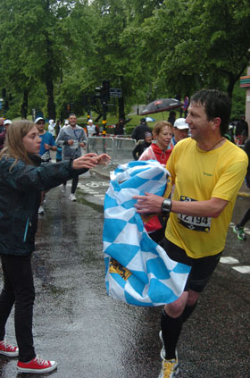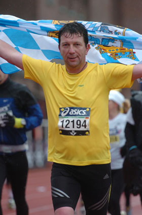 Kurz vor dem Olympiastadion träumte ich dann schon vom Einlauf und vergaß auch beinahe die Kälte. „Papa, die Fahne!“ – Aus meinen Gedanken gerissen sah ich Jessi und Christa am Straßenrand stehen. Jessi reichte mir wie versprochen die bayerische Fahne, die ich mit meinen Fingern kaum noch halten konnte, aber ich konnte sie mir zum wärmen ja noch umhängen. 500 Meter später sah ich dann Silke und Otto mit Kameras bewaffnet. Also gut, hoch mit der Fahne, war ja so ausgemacht. Dann ging‘s endlich rein ins Stadion. Die Ränge war gut gefüllt und der Applaus war riesig und tat so gut. Die Fahne musste natürlich nochmals etwas wehen lassen und schon war ich da. Auf der großen Anzeigetafel des Stadions konnte ich lesen: „Andreas Greppmeir – GER – 4:26.22“. Jiepp, ich war zufrieden. Um die 4:30 wollte ich laufen und das habe ich – trotz der Umstände – gut hinbekommen.