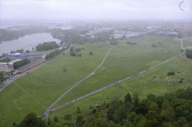 Durch den Stadtteil Slussen, der seinen Namen von der im 17. Jahrhundert erbauten Schleuse (Slussen) erhielt. Rund um die Schleuse gibt es heute, wie auch damals, viele Kneipen. Doch zum Einkehren bleibt keine Zeit. Zwischen Kilometer 7 – 8 sollte eigentlich wieder ein Highlight anstehen. Die Västerbron, ein endlos scheinende Brücke, sollte uns mit einem Blick nach rechts Stockholm in seiner vollen Pracht zeigen. Die Stadt war jedoch im dichten Regen kaum zu erkennen. Das interessierte jedoch kaum, der Wind auf der Brücke gab uns genug, woran wir uns erfreuen konnten. Bei Kilometer 9 überquerten wir im Stadtteil Kungsholmen noch mal eine kurze Brücke, die uns über einen Park führte. Dort fand gerade ein „Kubb“-Turnier statt. Ein einfaches aber spaßiges typisch schwedisches Spiel, das ich selbst ein paar Tage zuvor in Bosjön noch von Hartmut erklärt bekam und dort auch zum ersten Mal spielte.