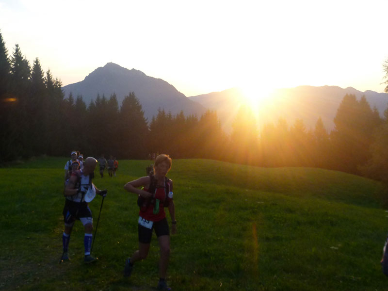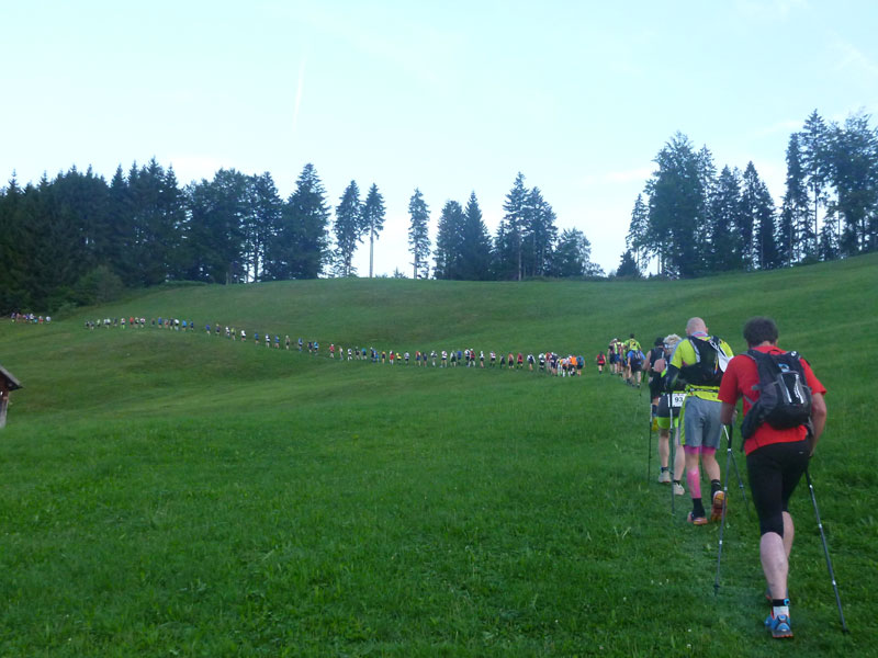 Auch heuer stehen wieder über 300 abgefahrene Typen im Dämmerlicht bereit um die Strapazen der fast 70 km langen Ultrastrecke mit 3000 Höhenmetern bei hochsommerlichen Temperaturen in Angriff zu nehmen. Um Punkt 6 Uhr geht’s los, nach wenigen hundert Meter haben wir Sonthofen hinter uns gelassen. Erst geht es noch flach ein Stück an der Iller und am Sonthofer Baggersee vorbei, bis wir die ersten Höhen bei den Hörnern packen. Vor uns liegen die Aufstiege über die Hörnergruppe. Bis auf wenige kurze steile Rampen sind die Anstiege alle gut zu bewältigen. Nach etwa einer halben Stunde gibt der Wächter des Allgäus die ersten Sonnenstrahlen frei, direkt hinter dem Bergrücken des Grünten bahnt sich die Sonne mit einem fotogenen Aufgang ihren Weg. Dass das im Verlaufe des Tages für uns nicht immer nur ein Segen sein muss, wissen alle Wiederholungstäter nur allzu gut. |