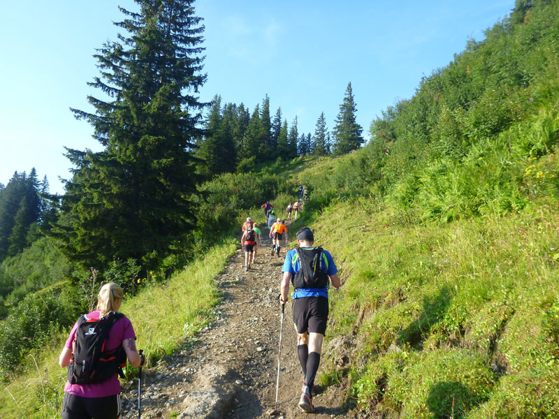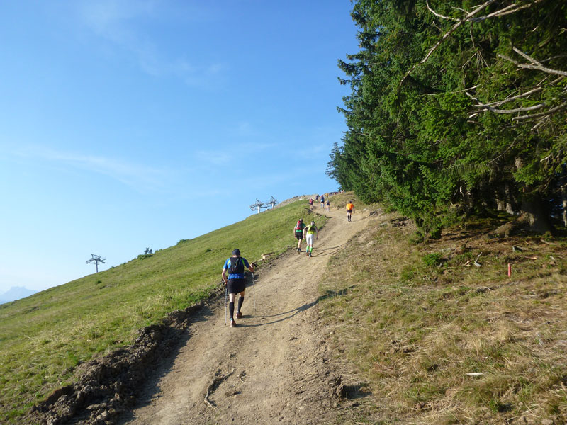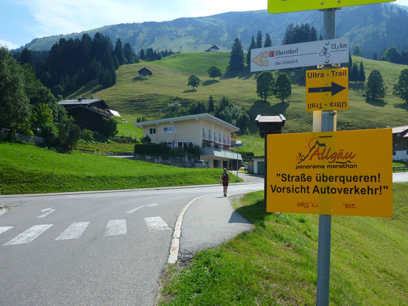 Ständig wechselndes Terrain über Teerstraßen, Wiesen, Wurzelpfade und Kieswege führt uns zur Weltcuphütte (km 7), wo wir erstmals Flüssigkeit aufnehmen können. Entlang der Flanken von Ofterschwanger Horn und Rangiswanger Horn geht es für uns zum ersten Höhepunkt auf den Weiherkopf (1665 m). Für Wintersportler entsteht hier gerade die neue Weiherkopf-Bahn, für sie musste der alte Schlepplift weichen. Das Angebot für Skifahrer ist auf der Hörnergruppe breit gestreut, es reicht von einfachen Pisten bis hin zu einer FIS-Abfahrt und -Slalomstrecke vom Weiherkopf sowie einer schwarzen Piste in Ofterschwang, an der ebenfalls Weltcuprennen stattfinden.