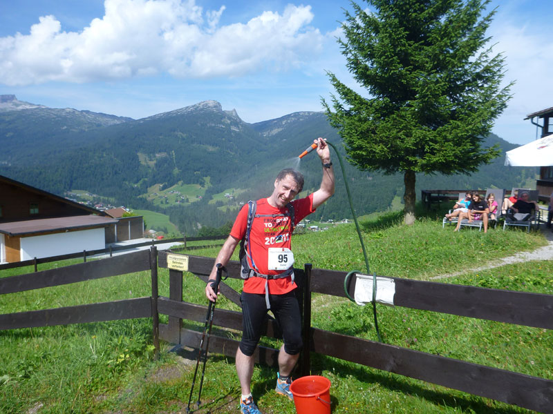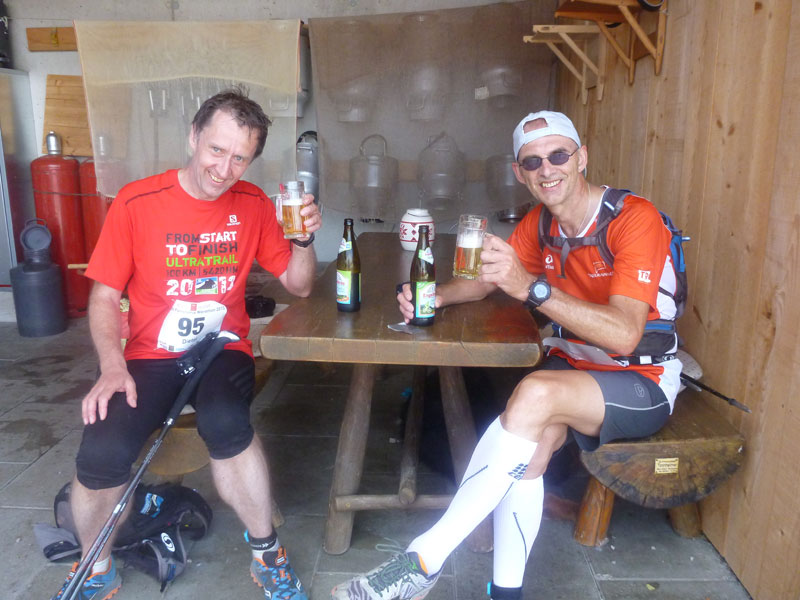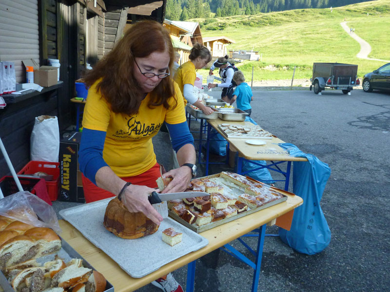 Am Hörnlepass überschreiten wir die Grenze ins österreichische Bundesland Vorarlberg, wenig später erreichen wir am gleichnamigen Gasthof die nächste große Labestelle (km 32). Vom Veranstalter gab es die Möglichkeit hierher Drob bags mit Wechselkleidung bringen zu lassen. Ich habe alles am Mann und benötige den Service nicht. Dafür umso mehr das reichhaltige Verpflegungsangebot.