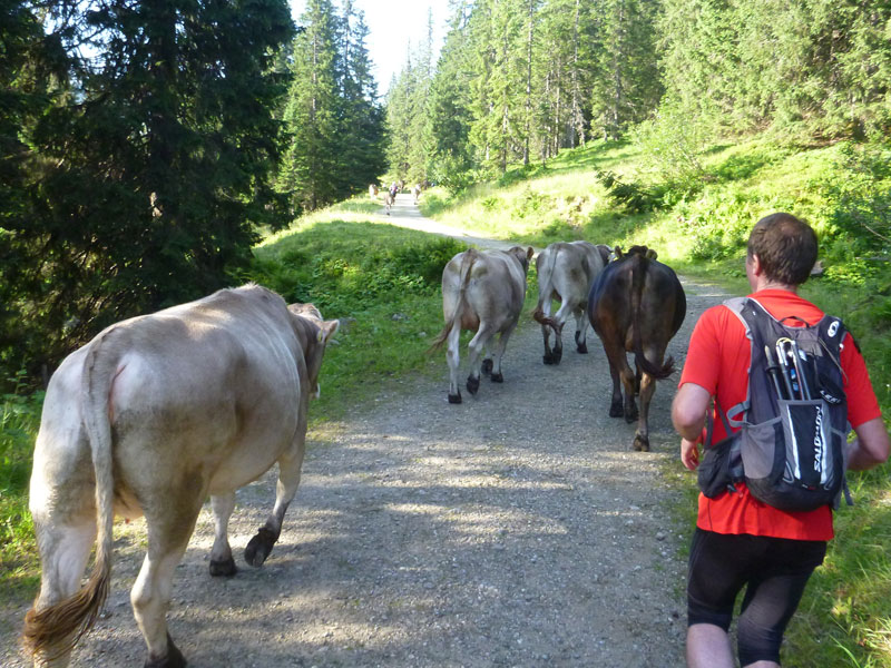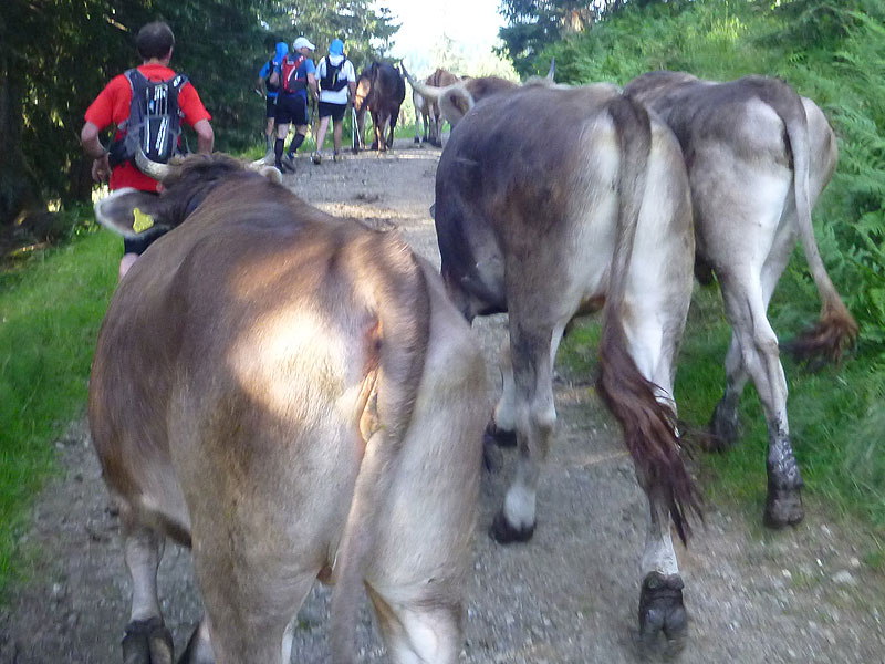 Nach ausgiebiger Stärkung mache ich mich wieder mit Dieter auf den Weg. Es geht weiter abwärts. Recht unspektakulär beginnt für uns beide ein kleines Abenteuer auf dem nächsten Kilometer. Eine Viererbande Allgäuer Kühe fühlt sich durch unser Sporteln angespornt und jagt blöckend neben uns her. Die Dunkle sieht gefährlich aus und macht sich auch am lautesten bemerkbar. Und je weiter wir laufen, umso mehr Rindviecher gesellen sich dazu. Dabei schließen wir auch zu anderen Läufern auf, es entwickelt sich eine kleine Stampede. „Kuhl“ bleiben Brauner. Wir lassen uns nichts anmerken, werden auch nicht hektisch und bewegen uns so, inmitten von etwa 20 Rindern vorsichtig weiter. Am nächsten Viehgatter endet unser „kuhler“ Trail über die Hörner im doppelten Sinn, wir verlassen nicht nur die Ansammlung der nervösen Hornträger sondern sind auch am Ende unserer Hörnertour.