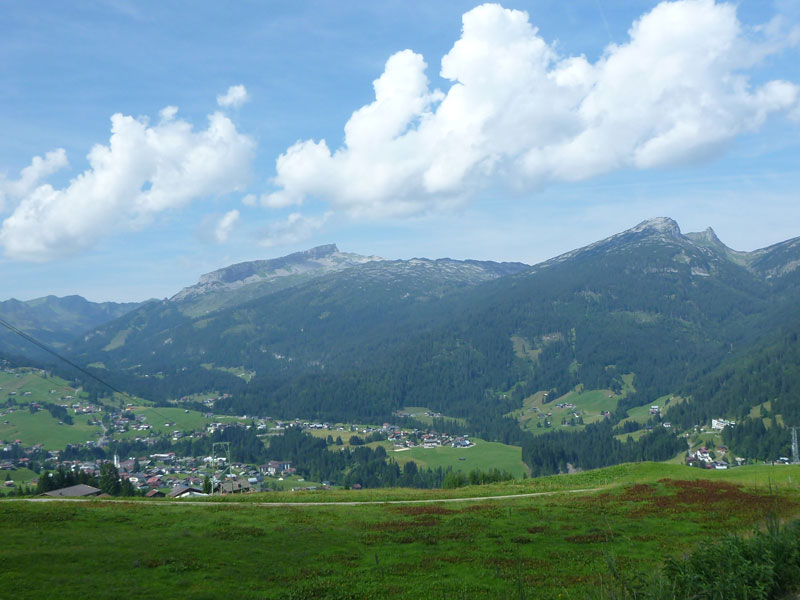 In Riezlern überqueren wir zuerst die Breitach auf einer mächtigen Brücke und wenig später die Autostraße die bis ans Ende des Kleinwalsertales führt. Das Tal ist per PKW nur auf diesem Weg aus Deutschland zu erreichen, es gibt auch wegen seiner geographischen Lage keine direkte Straßenverbindung zum übrigen Österreich. Für uns geht es nach der Überquerung anfangs steil nach oben. Bis zur Söllereckbahn (km 40) sind auf breiten Wanderwegen, meist in der prallen Sonne, auf den nächsten 5 km zusätzlich 440 Hm zu bewältigen. Alleine ist man hier nicht unterwegs, zahlreiche Ausflügler sind auf ihren Wanderungen unterwegs.
