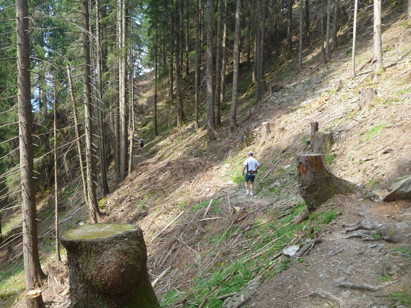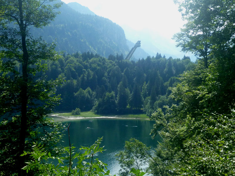 Der fast 700 Hm lange Abstieg hinunter ins Tal führt überwiegend durch den Wald und ist meist gut zu laufen. Zwischendrin liegt ein etwas schwierigerer steiler Abschnitt mit Stufen und Wurzeln durchsetzt, hier gilt es die Augen offen zu halten. Oberhalb des Freibergsees öffnet sich eine Lücke im Wald und gibt die Sicht frei auf die Heini-Klopfer-Skiflugschanze mit ihrer frei ausragenden Spannbeton-Konstruktion. Die Obersdorfer bezeichnen sie auch gerne als „schiefen Turm von Oberstdorf“. Die Schanze ist ausschließlich in Höhe des Absprungtisches mit Felsankern am Berg befestigt und die drittgrößte in der Welt.