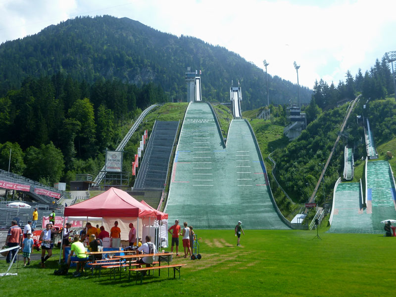 Zweieinhalb Kilometer sind noch im Tal zurückzulegen, bevor wir in der Erdinger Arena bei den Skisprungschanzen eintreffen. Hier wird gesprungen, im Gegensatz zur vorherigen Schanze wo geflogen wird. Verrückt sind sie alle, denke ich mir, noch mehr als wir. Selbstverständlich wird in der Erdinger Arena auch gleichnamiges serviert und dankend von mir angenommen. Zum Zeitlimit von 8:30 Std. haben Dieter und ich noch eine Stunde Luft, so bleibt Zeit für eine ausgiebige Pause. Wer will, könnte sich auch massieren lassen.