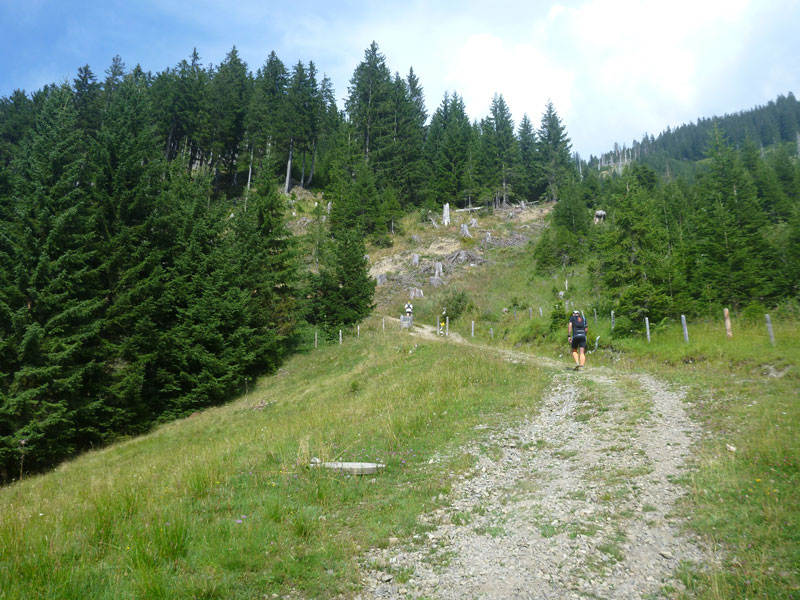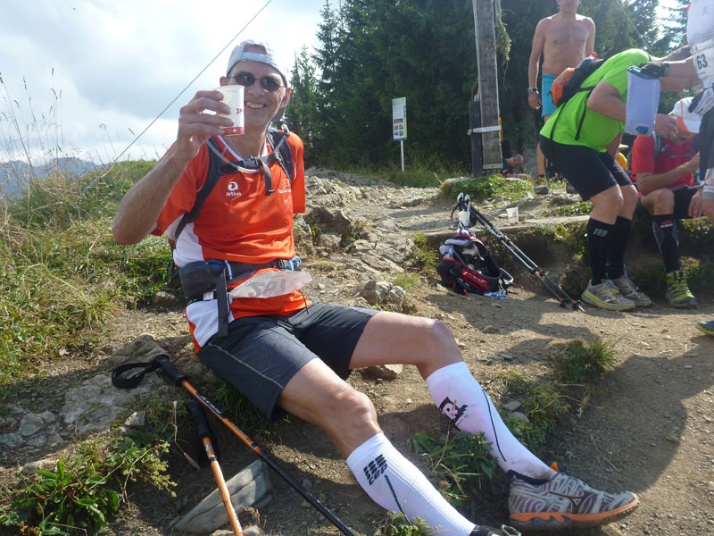Vom Gipfel liegen noch 10 km vor uns, aber es geht nur mehr bergab. Vorsicht ist geboten auf dem ersten Kilometer des nachfolgenden Abstiegs, der ist nicht von Pappe, technisch nicht einfach und dazu noch mit dem harten Aufstieg in den Knochen kann man schnell stolpern. Hab ich schon mit eigenen Augen erlebt. Eine prima Labe erwartet uns bei km 61, für den langen Downhill genehmige ich nochmal eine ausgiebige Stärkung. Ab hier kann man es laufen lassen. Abwechselnd über Schotterwege, Grashügel und Teerstraßen.