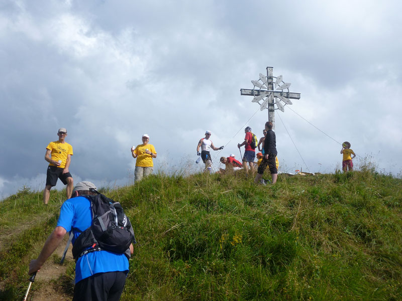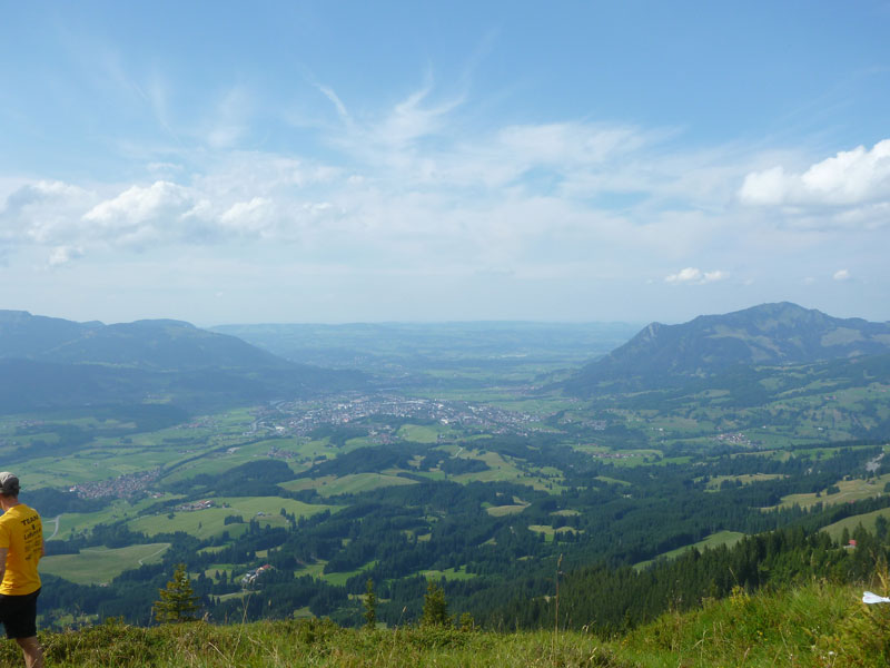 Unmittelbar nach der nächsten Wasserstation wird es richtig ernst, der Weg zweigt auf einen Pfad zum Sonnenkopf ab. Der folgende Abschnitt ist der anspruchsvollste des gesamten Ultra Trails und bei den meisten schon berüchtigt. Durch den Wald geht es supersteil auf einem ausgetretenen Pfad nach oben. Im letzten Drittel des Aufstiegs verlassen wir abschnittsweise den Wald, ich habe noch in Erinnerung, dass das Gipfelkreuz dann bald in Sichtweite kommen wird und so ist es auch. Helfer motivieren von oben herunter auf den letzten Metern, dann ist der finale Aufstieg geschafft. Man hat sogar Kanister mit Wasser bis hier herauf geschafft und versorgt uns damit. Die Rundumsicht ist großartig und das Zielbanner in Sonthofen mit ein bisschen Phantasie auch schon zu auszumachen. Fast alle verharren und verschnaufen hier ein paar Minuten und genießen diese herrliche Aussicht.