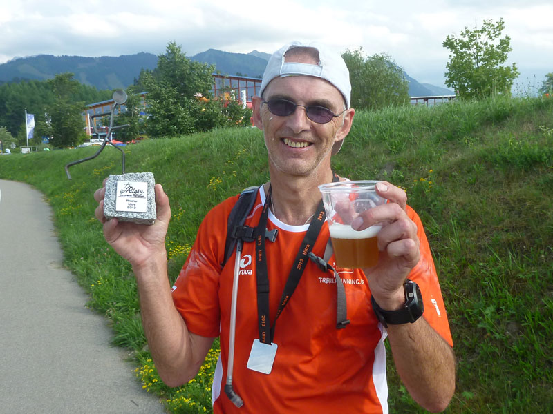 Wie immer empfängt uns Orga-Chef Axel Reusch unter dem Zielbanner vor dem Freizeitbad Wonnemar und gratuliert jedem persönlich. Ich freue mich ganz besonders auf mein 3. Allgäuer Steinmännle und werde ihm auch wieder einen Ehrenplatz einräumen. Neben den vielen tollen Antrittsgeschenken wie Rucksack, Stirnband, Schlauchtuch, Pflegeset und noch einigen anderen Leistungen befindet sich auch ein Gutschein für einen kostenfreien Eintritt ins Wonnemar im Antrittsgeld und den werde ich jetzt umgehend einlösen um wieder auf den Damm zu kommen und für die Heimfahrt gerüstet zu sein.