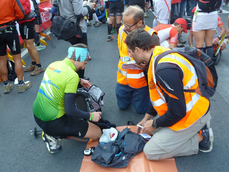 Bei der Abholung der Startunterlagen wurden die wichtigsten Teile der Pflichtausrüstung kontrolliert, was dem Veranstalter natürlich nicht garantiert, dass jeder auch alles letztendlich auch beim Rennen dabei hat. Für den Fall werden an diversen Stellen vereinzelt Stichproben durchgeführt, auch hier ist man streng. Je nach Wichtigkeit werden Zeitstrafen von einer Stunde bis zum sofortigen Ausschluss aus dem Rennen verhängt. Die Kontrollen werden auch wirklich durchgeführt. 50 Meter vor der Startlinie z. B. darf ein Läufer sein komplettes Equipment auf einer Decke vor den Kontrolleuren ausbreiten.