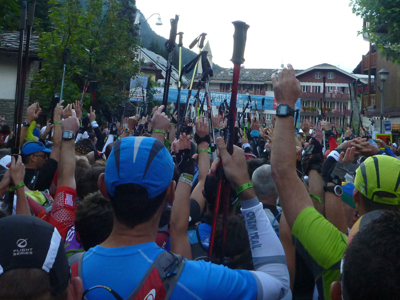 Um 8:30 Uhr wird es langsam ernst, die Startgerade füllt sich zusehends. Jan und Tom habe ich aus den Augen verloren. Ein letztes kurzes Briefing und Ansprachen. Ich verstehe nichts davon, kann weder italienisch noch französisch. Aber die Nationalhymnen von den ausrichtenden Ländern Italien, Schweiz und Frankreich erkenne ich. Es geht unter die Haut. Die Stimmung wird weiter angeheizt mit dramatischer Musik von Vangelis: Alexander – Across the Mountains. Das lässt keinen kalt, alle jubeln, Arme und Stöcke gehen in die Höhe. Die Spannung steigt. Ich habe Gänsehaut. Dann der Countdown: …cinq – quatre – trois – deux – une – Los geht’s, GPS starten und langsam aufrücken. Bis vor wenigen Monaten konnte ich mir im Traum nicht vorstellen, hier beim berühmtesten und bedeutendsten Trail Race der Welt teilzunehmen. Auch wenn es nur der „Bambinilauf“ ist, die 101 Kilometer und 6100 Höhenmeter müssen erst einmal bezwungen werden.