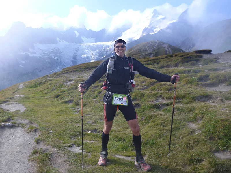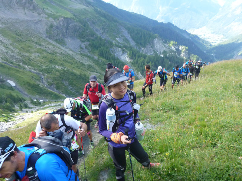 Auf halber Höhe kann ich Bei überholen, ihr bereiten die Aufstiege auch einige Probleme. Für gewöhnlich sind mehr die Wüsten ihr Terrain. Bis auf den Bergrücken des südlichen Tête de la Tronche sind auf den ersten 10 Kilometern fast 1.500 Höhenmeter zu bewältigen. Der längste Anstieg des CCC beinhaltet auch den höchsten Punkt auf 2.569 m. Dafür werden wir aber auch mit einem herrlichen Blick auf das Mont Blanc Massiv belohnt. Auf unseren Startnummern befindet sich ein Strichcode, der wird hier zum ersten Mal gescannt und so ist für jedermann unsere Position auf der Veranstalter-Website einsehbar.