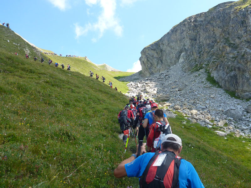 Nach Verlassen des Waldes geht es abwechselnd mal auf mal ab durch einige Senken und über Wasserläufe, aber bald gibt es nur mehr eine Richtung und die geht streng nach oben. Für mich auch der richtige Zeitpunkt, um meine Stöcke vom Rucksack zu schnallen um den Aufstieg etwas erträglicher zu gestalten. Auf schmalen ausgetretenen Pfaden klettern wir durch die grasbewachsenen Hügel des Col du Sapin. Wie auf einer Perlenkette aufgezogen marschiert die kilometerlange Läuferschlange voran. Aber je länger es dauert, umso mehr Lücken entstehen in der durchgehenden Anordnung, manche müssen abreißen lassen. Überholvorgänge sind dennoch nur möglich, wenn der Vordermann mitspielt.