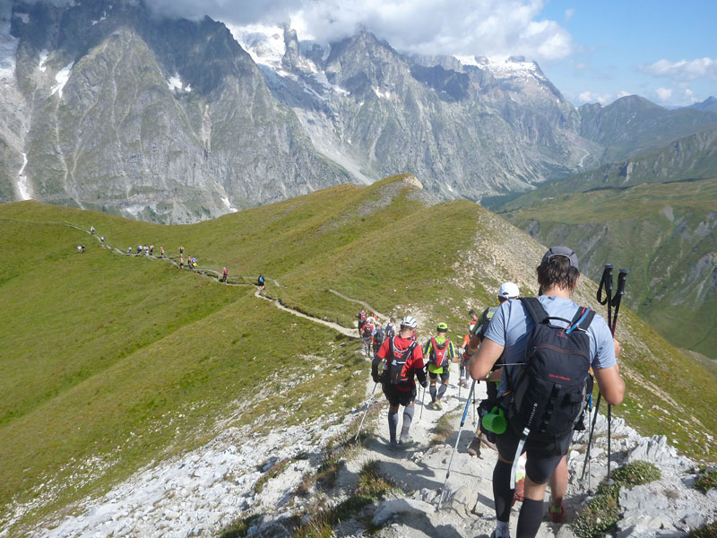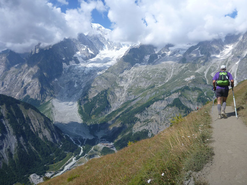 Mit einem kurzen Anstieg geht es weiter. Bei ist wieder vor mir, sie muss bergab geflogen sein. Bis zur nächsten Verpflegung am Refuge Bonatti liegen 7 km vor uns. Diese führen auf halber Höhe an der Flanke des Mont de la Saxe entlang mit bester Aussicht ins Val Ferret und auf den gegenüberliegenden mehrgipfligen Grandes Jorasses (4.208 m) mit seiner markanten Gletscherzunge. Unter Bergsteigern ist seine fast lotrechte Nordwand berühmt, die sich 1.000 m hoch erhebt. Sie zählte zusammen mit den Nordwänden von Matterhorn und Eiger zu den drei letzten Problemen der Alpen, bevor sie 1935 erstmals bezwungen wurde. Die berüchtigte Linceul (Leichentuch)-Route, ebenfalls an der Nordwand, weißt den französischen Schwierigkeitsgrad TD+ (très difficile supérieur) auf und zieht viele verwegene Kletterer an.