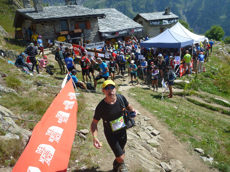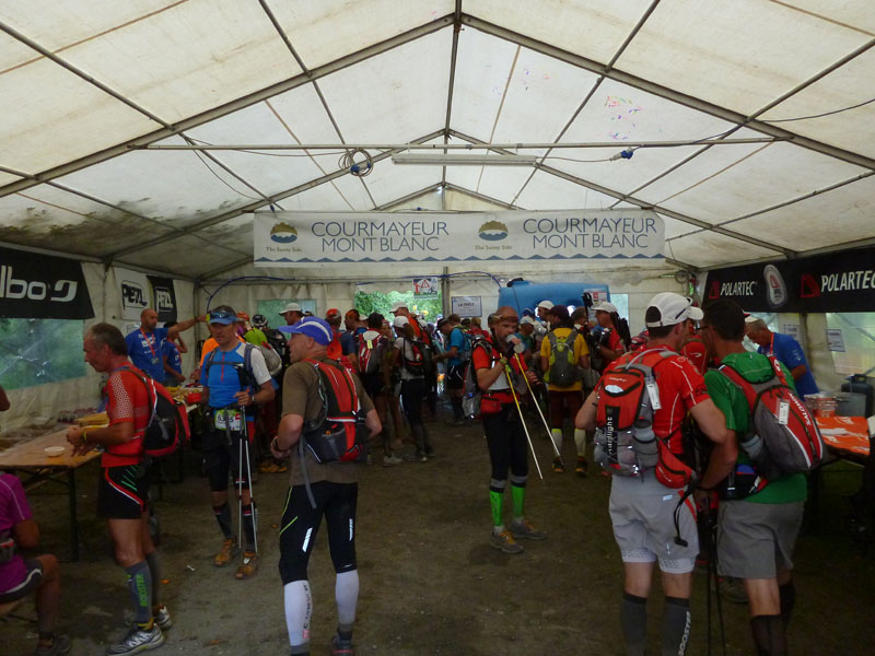 Über den Grat des Mont de la Saxe geht es meist gut zu Laufen abwärts bis zur ersten Verpflegungsstelle (km15) bei den Bertone Hütten. Die letzten Meter sind aber sehr steil. Wieder werden unsere Startnummern gescannt. Der lange Aufstieg zeigt bei mir deutliche Wirkung, ich benötige die anstehende Pause dringend. Stärken können wir uns mit Linzer Törtchen, Riegeln und Nudelsuppe. Am Refuge Bertone vereint sich auch die Strecke des UTMB nach 82 km mit der des CCC. Der lange Aufstieg über den Tete de la Tronche bleibt den UTMB-lern erspart, sie nehmen nach Courmayeur eine Abkürzung hier herauf. Jan kommt kurz hinter mir an die Labestelle. Er war in der dritten Startgruppe und hat somit 15 Minuten auf mich aufgeholt.