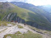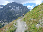 Nach Überqueren der Doire du Val Ferret beginnt unser zweiter langer Anstieg. Bis auf den Kulminationspunkt auf dem Grand Col Ferret sind 750 Hm in nur 5 Kilometern zu überwinden. Ich traue fast meinen Augen nicht, als ich plötzlicher wieder Bei vor mir ausmachen kann. Ich hätte ihr das mit ihren Aufstiegsproblemen gar nicht zugetraut, aber unsere Wüstenkriegerin scheint ein zähes Luder zu sein und alles bergab wieder gut zu machen. Ich freue mich aber, dass sie noch gut mit dabei ist und dass ich jetzt auch innerhalb weniger Minuten alle CCC-Starter des Deutschen Hauses getroffen habe.