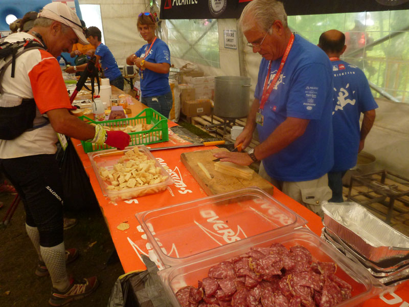 In einem großen Zelt ist die Labestelle untergebracht und es ist eine Menge los. An vielen Tischen kann man sich etwas zu Essen und Trinken holen. Das Angebot ist überaus reichlich, mir ist wie immer bei langen Läufen eher nach etwas Deftigen. Also genehmige ich mir Salami, Käse, Weißbrot und eine Nudelsuppe. Ein riesiger Tisch mit süßen Sachen kann mich weniger locken. Als ich mich an einen Tisch begebe sitzen Jan und Tom bereits da. Nach ihren Aussagen geht es ihnen nicht viel besser als mir. Tom erzählt begeistert von seiner „Heldentat“ am Start. Von der Anfangseuphorie ist jetzt aber bei uns allen nichts mehr spürbar. Das Deutsche Haus hat noch einen schweren Weg vor sich.
