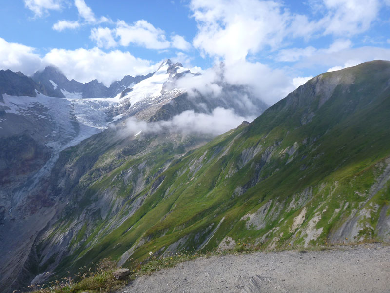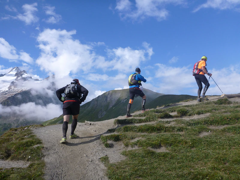 La Fouly, km 42 – Zeitlimit 10:30 Stunden Durchgängig bis zu seinem höchsten Punkt auf 2.537 m ist der Grand Col Ferret grasbewachsen ohne sonstigen Bewuchs, er wird lediglich von kleineren Felsbändern durchzogen. So stellen sich uns keine unangenehmen Hindernisse in den Weg. Aber der Pfad hinauf ist steil und nur langsam und mühsam winden wir uns auf Serpentinen nach oben. Entschädigt werden wir aber mit einer grandiosen Landschaft. Mir gefällt besonders der Kontrast der grünen Wiesenflächen zum gegenüberliegenden steinigen Hochgebirge mit seinen schneebedeckten Gipfeln. Ein Gletscher präsentiert uns aus nächster Nähe seine weit herunterfließende schmutzig-graue Gletscherzunge. Ein Blick zurück öffnet uns das gesamte Val de Ferret und dazu strahlt ein weiß-blauer Himmel, der seinesgleichen sucht. Es scheint, als würde das Wetter in diesen Tagen all jenes wieder gut machen wollen, was es bei den vergangenen drei Austragungen versaut hat.
