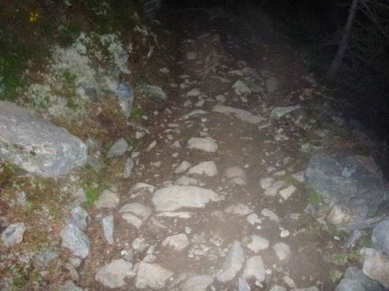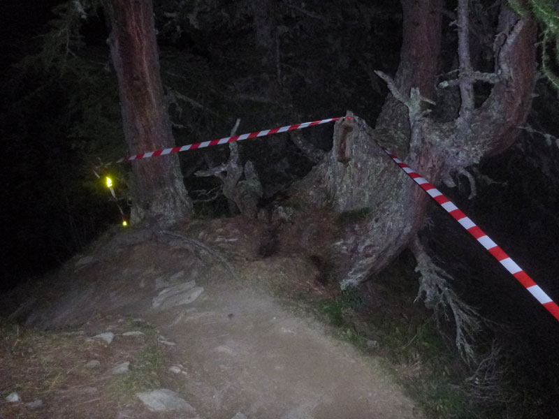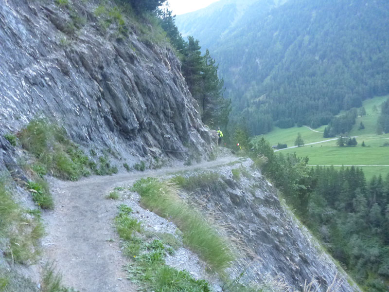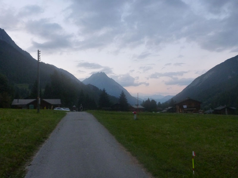 Mit mäßigem Gefälle geht es weiter, durch den Wald und entlang des Flußbettes der Dranse de Ferret. Steinig und unangenehm ist der Weg, obwohl er sehr flach ist. Ich bin noch steif und kaputt, komme nicht so richtig in die Gänge. Es wird langsam dämmrig. Kurze Aufstiege sind jetzt auch dabei. Wir laufen oberhalb des Flusses an der Bergflanke entlang. Es läuft wieder besser. Die Strecke ist schön am Hang und der Trail auch wieder angenehmer zu laufen. Ein letztes steiles Gefälle und ich erreiche eine Straße. Eine große Gruppe Schlachtenbummler feuert mich an. Es ist schon verdammt dunkel. Ich habe auch noch meine Sonnenbrille auf, die muss gewechselt werden und die Stirnlampe muss raus. Weiter geht’s. Alles im Laufschritt. Es läuft wieder.