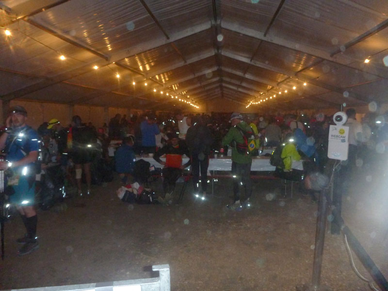 Neben dem Eingang ein Stand f ür die Ausrüstungskontrolle. Ich habe Glück und bleibe davon verschont. Daneben ein Tisch für den Busrücktransport …falls man Aussteigen will. Ich bin völlig down, sehr verlockend, aber keine Alternative. Ich gebe mich nicht geschlagen. Habe nach meiner günstigsten Rechnung ein Zeitpolster von 1:30 Stunden und die werde ich ausnützen. Die Zeit-Barrieren haben aber auch immer neben der Laufzeit eine Uhrzeitgrenze, in der die um 15 Minuten verspätete Startzeit nicht eingerechnet ist. Dazu kommen noch die 10 Minuten Zugabe anhand der kurzfristigen Streckenverlängerung. Auch hier sind die ausgehängten Kilometerangaben noch nicht auf dem aktuellsten Stand. Dadurch bin ich immer etwas verunsichert ob der genauen Durchgangszeiten. Nach der ungünstigsten Rechnung ist es nur eine gute Stunde.