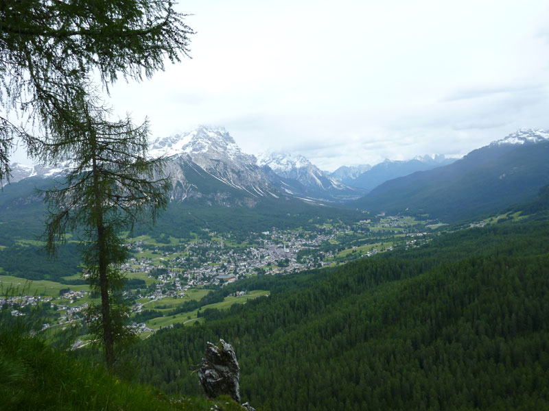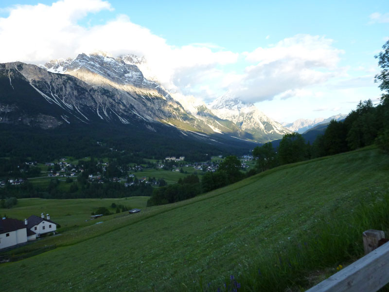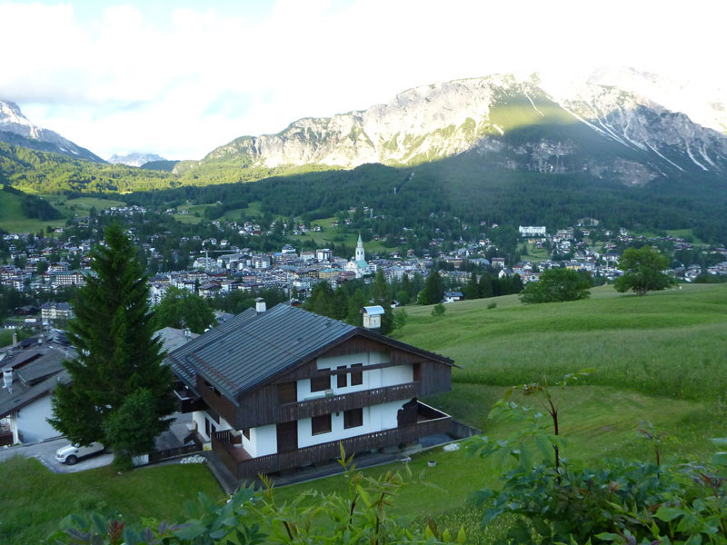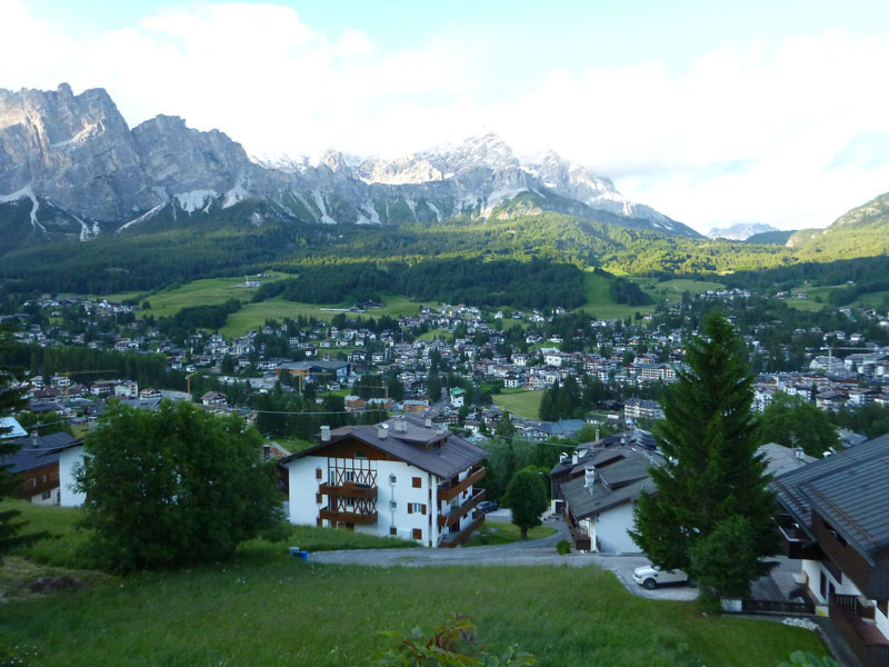 Über Brenner und Autobahnausfahrt Brixen erreiche ich Cortina d‘Ampezzo. Der Ort liegt auf einer Höhe von 1.200 Metern im herrlich gelegenen Valle del Boite und wird nicht umsonst als Königin der Dolomiten bezeichnet. Über den Köpfen thronen majestätisch die über 3000 m hohen Gipfel des Tofana di Mezzo, Monte Cristallo und Sorapis. Bereits die Einfahrt in die Talmulde ist eine echte Schau. Besonders empfehlenswert für Nichtläufer oder jemand der nicht sonst irgendwie hinauf kraxeln will, ist ein kleiner Ausflug mit dem Kfz hinauf, Richtung Valzarego Pass. 2 – 3 Kilometer genügen, der wunderbare Anblick von Cortina von oben lohnt sich. Bevorzugt vor Sonnenuntergang.