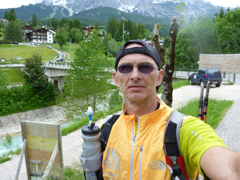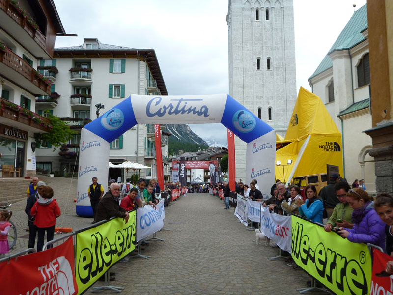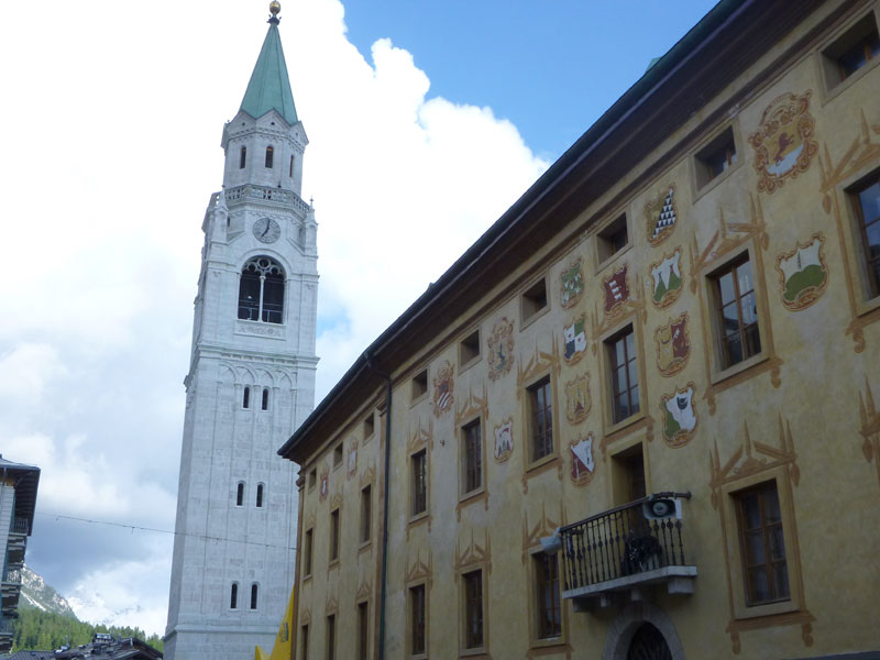 Die Nacht war zwar kalt, aber kurz vor 8 Uhr, beim Start des LUT sind die Temperaturen bereits wieder in den zweistelligen Bereich geklettert. Gestartet wird im Zentrum von Cortina auf dem Corso Italia. Nicht schwer zu finden, da der Start- und Zielbogen direkt neben der erst vor kurzem aufwendig renovierten Kirche Parrocchiale SS. Filippo e Giacomo und ihrem 70 Meter hohen Turm aus Dolomitblöcken aufgebaut ist. Auf seiner Spitze befindet sich eine vergoldete Kugel mit einem Meter Durchmesser; das markante Geläute der sechs historischen Glocken ertönt mit der Melodie von Big Ben.