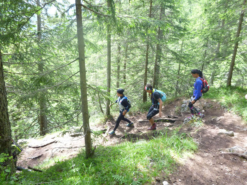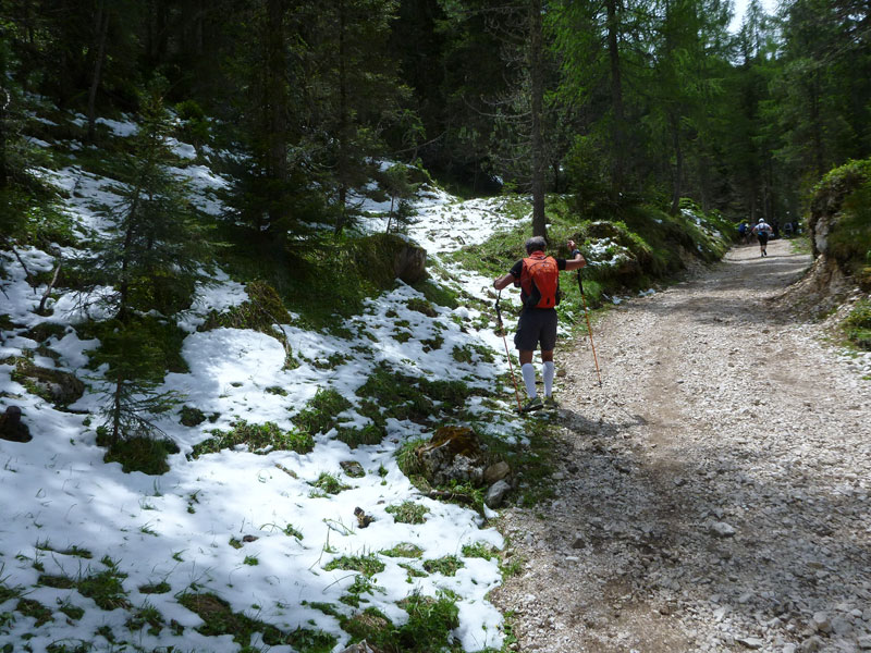 Direkt nach der VP ist die Abzweigung, die unseren Kurs vom Lavaredo trennt. Während wir die Abkürzung nehmen, geht es für die Ultras auf eine Schleife Richtung Drei Zinnen. Flach geht es für uns vorerst für die nächsten 3 km weiter, bevor der steile Anstieg zum Forcella Lerosa beginnt. 500 Höhenmeter beinhaltet der 5 km lange Aufstieg zum höchsten Punkt unseres heutigen Tages auf 2.000 m. Erste Schneereste begleiten uns seitlich des Weges auf dem letzten Teil des Anstieges, das meiste ist auf dieser Höhe aber bereits wieder geschmolzen.