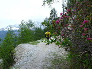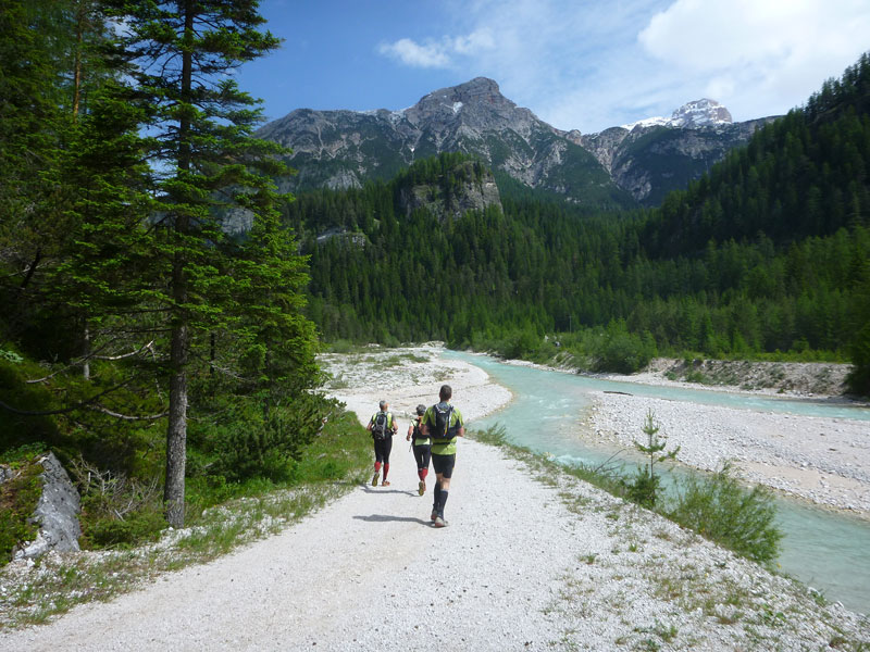 Ein wunderbarer Single-Trail auf weichem Waldboden führt uns in Serpentinen wieder hinunter bis zum Flussbett des Boite, der hier oben entspringt und auf seinem 46 km langen Weg durchs Boite-Tal nach Cortina fließt. Für uns gilt es jetzt ein paar relativ ebene Kilometer auf Forstwegen bis zur ersten Verpflegungsstation bei km 18 zu absolvieren. Für mich gibt es ein Bierchen zum Frühschoppen. Das schön gekühlte italienische „Forst“ lässt sich wirklich gut trinken im Sonnenschein.