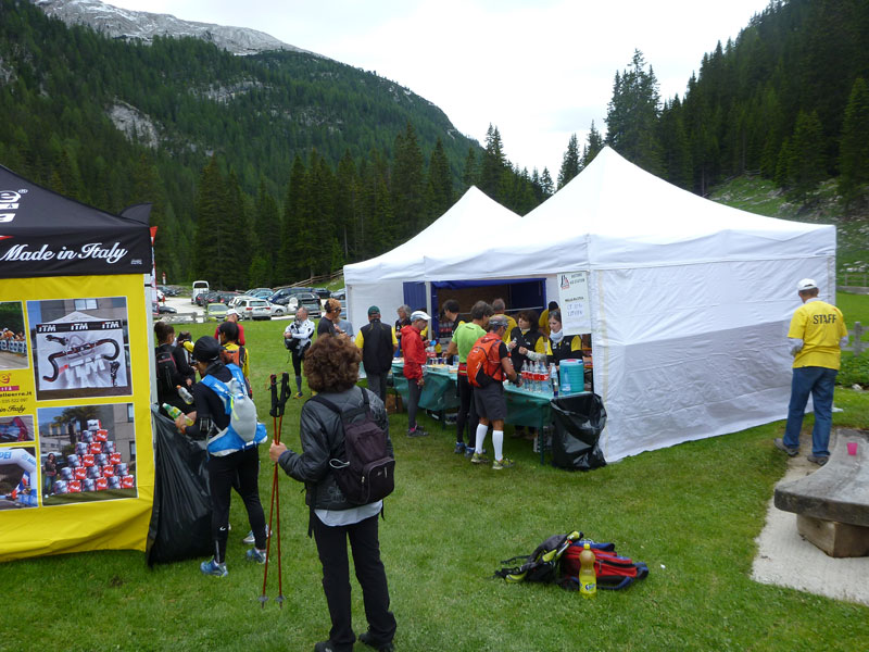 In zwanzig Minuten bin ich wieder auf halben Wege herunter. In der Mitte eines langen Tals, an der Grenze zum Naturpark Fanes-Sennes-Prags ist an der Alpe Ra Stua VP2 (km 30) errichtet. Die Läufer des LUT haben hier bereits 67 km auf ihrem Tacho. Verteilt auf mehrere Zelte kann hier richtig geschlemmt werden. Für mich ein unbedingtes Muss bei langen Trails. Ich nehme mir sehr viel Zeit um diverse Leckereien durchzuprobieren. Deftige italienische Salami, würziger Käse, Nutelabrötchen, Nudelsuppe, Kuchen, Schokolade und und und, alles ist dabei, es bleiben kaum Wünsche offen. Ja, natürlich, auch wieder „Forst“.