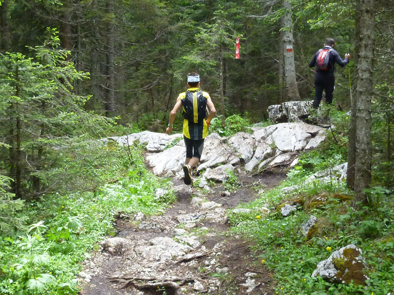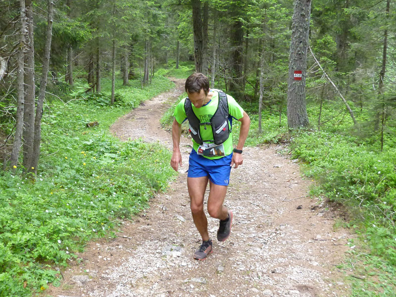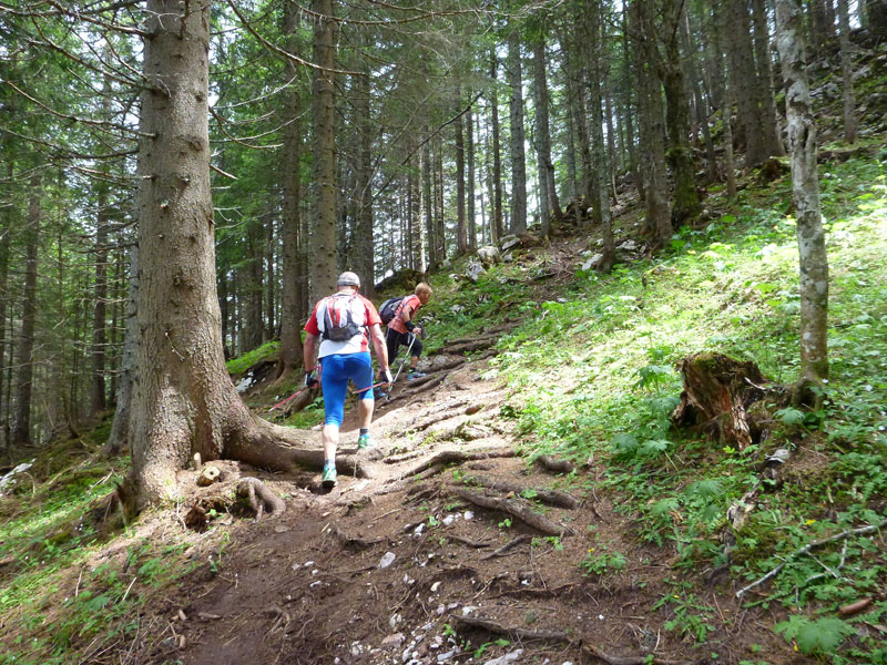 Kurz nach unserer Jausenstation werde ich bereits von Sébastien Spehler dem führenden Läufer des LUT überholt. Von hinten kommt lange nichts mehr, er hat einen riesen Vorsprung. Wurzelig und trailig geht es noch einige Zeit für uns abwärts. Immer wieder passieren wir Wanderer, die uns ausnahmslos anfeuern.