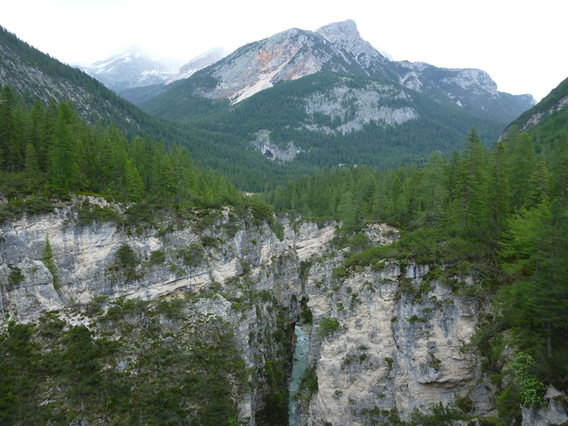 Nach etwa 36 Kilometern erreiche ich die Aussicht in eines der schönsten Bergtäler der Dolomiten: das Travenanzestal – ein Supercanyon ohne Gegenstück in den Dolomiten. Eingehauen zwischen den Wandfluchten der Tofana- und Fanisgruppe, durchtost von den Wassermassen des Travenanzesbaches bietet sich uns ein überwältigendes Naturerlebnis. Fast wäre ich achtlos daran vorbei gelaufen aber einige Hinweistafeln ließen mich doch neugierig werden. Ein kleiner Abstieg durch ein paar Bäume an den Rand der Schlucht beschert mir einen großartigen Ausblick weit hinein in den wilden, naturbelassenen Canyon. Es sind genau diese Augenblicke und Entdeckungen während eines Rennens die mich das Trailrunning so begeistern lassen.